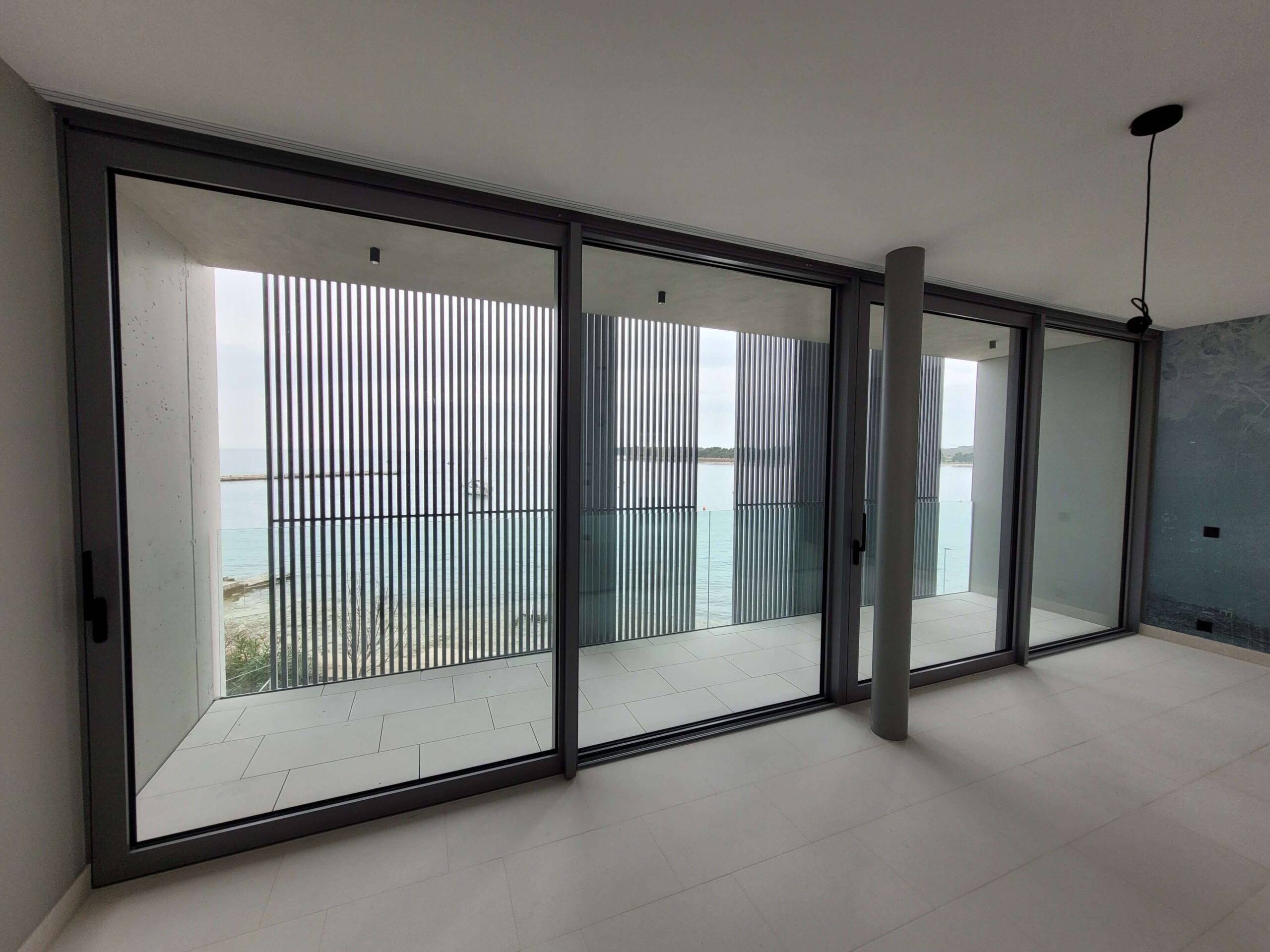 Manuell geführte Schiebepaneele bilden eine dynamische Fassadenlösung, die speziell für anspruchsvolle Bedingungen an der Meeresküste entwickelt wurde – einschließlich Windgeschwindigkeiten von bis zu 120 km/h. Die durchdachte Konstruktion mit Paneelen bis zu 350 cm Höhe gewährleistet hohe Stabilität. Die Paneele gleiten sanft entlang der Führungsschienen und verriegeln sich zuverlässig an den Endpunkten, dank eines patentierten Federstahl-Verschlusssystems, das ein unbeabsichtigtes Öffnen oder Schließen bei starkem Wind verhindert.