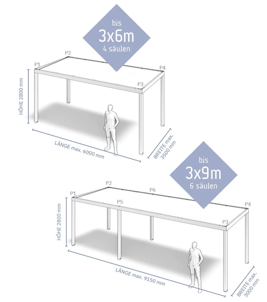 - Maße auf 6 Pfosten: bis zu 9150x6000x2800 mm