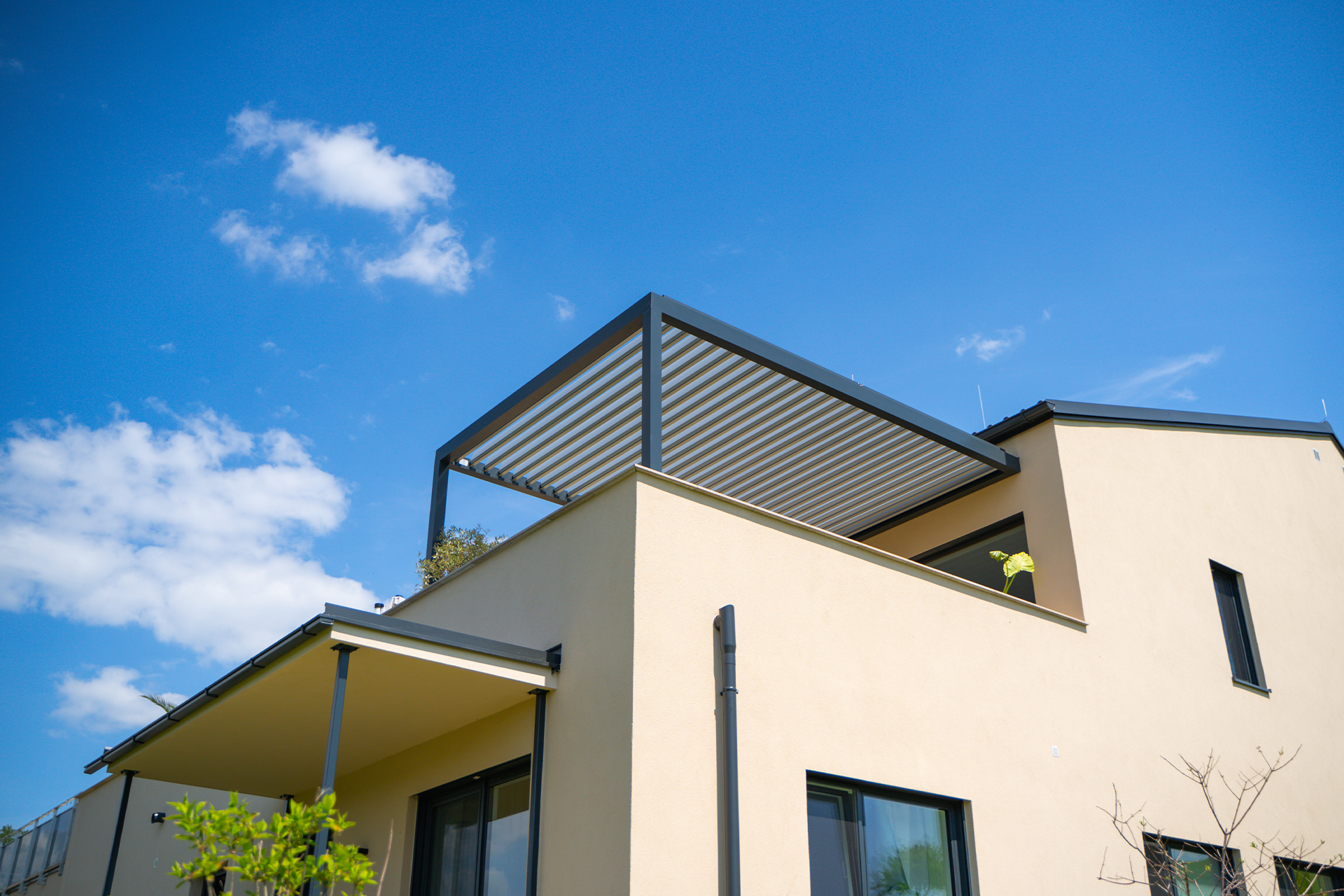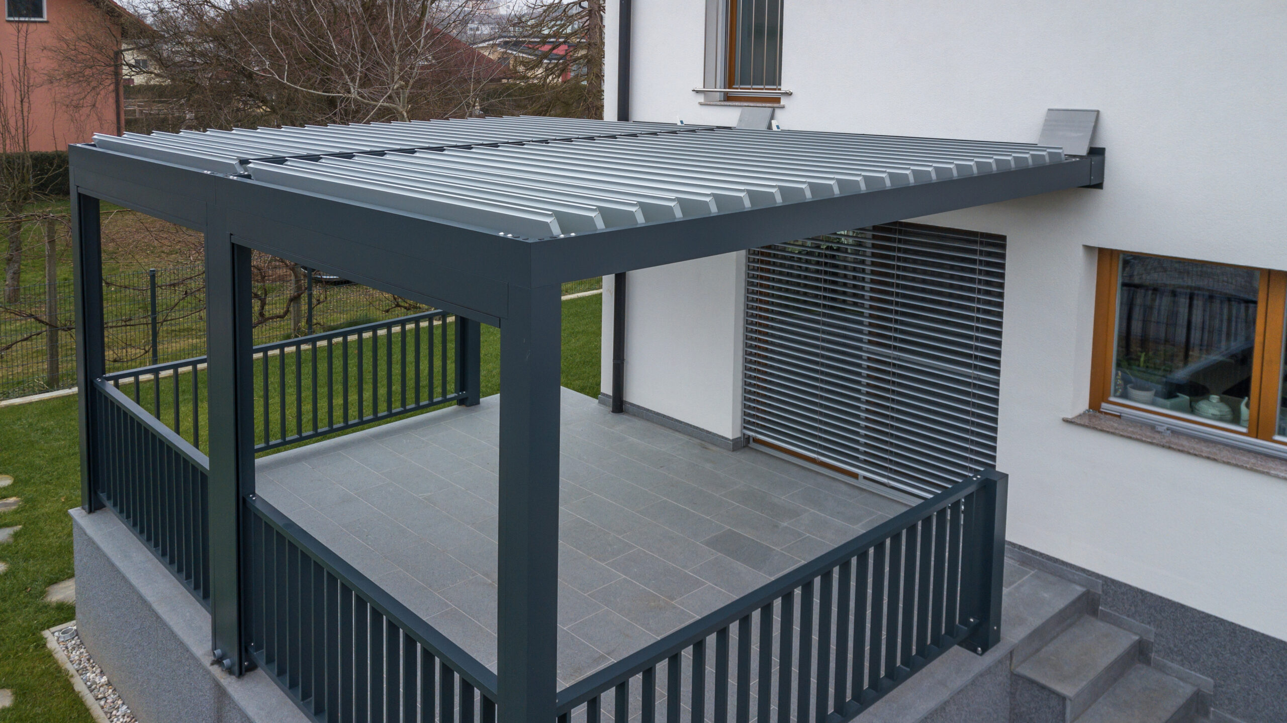 Pergola zadržava svjetlost i pogled kroz panoramski prozor Pergola zadržava svjetlost i pogled kroz panoramski prozor