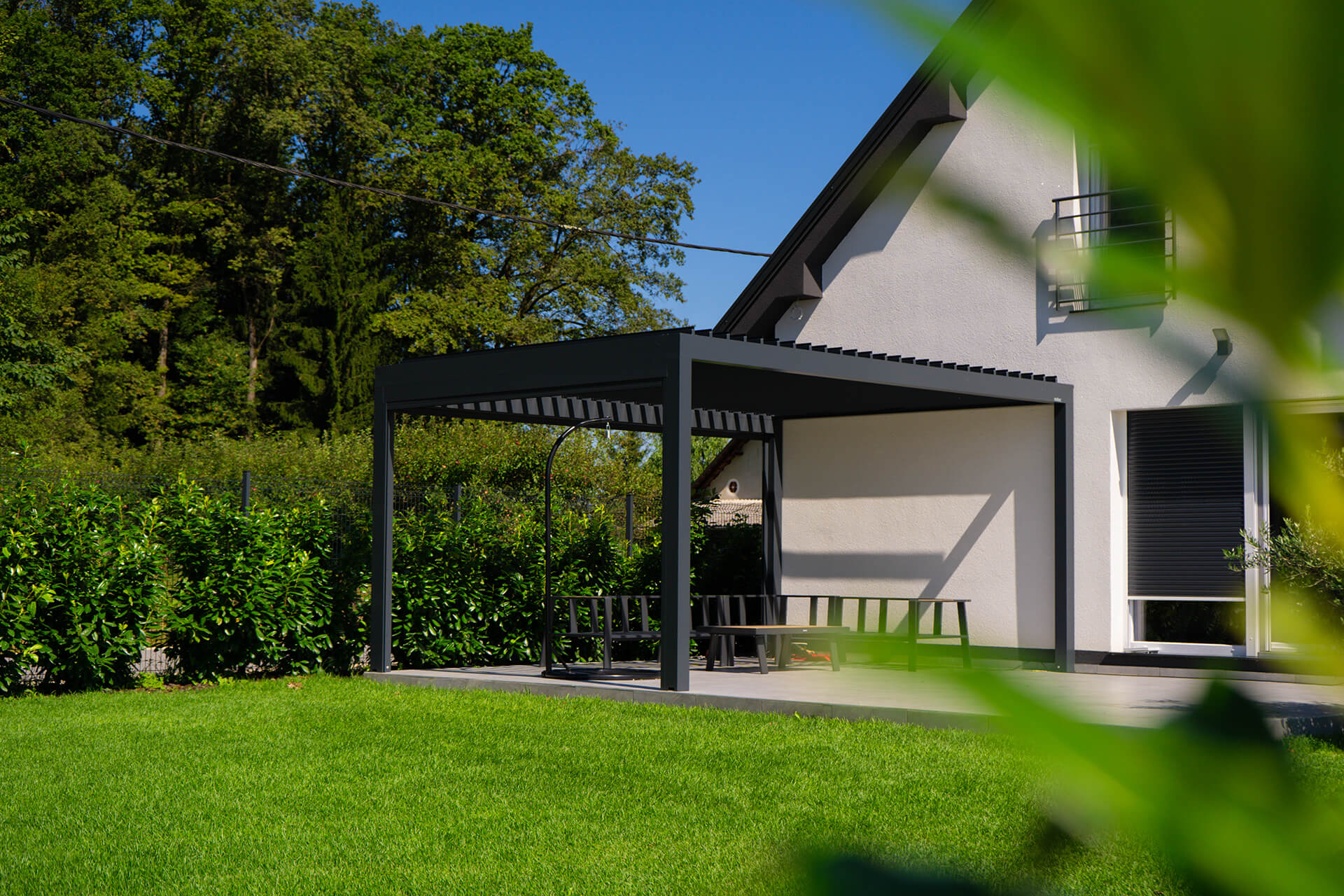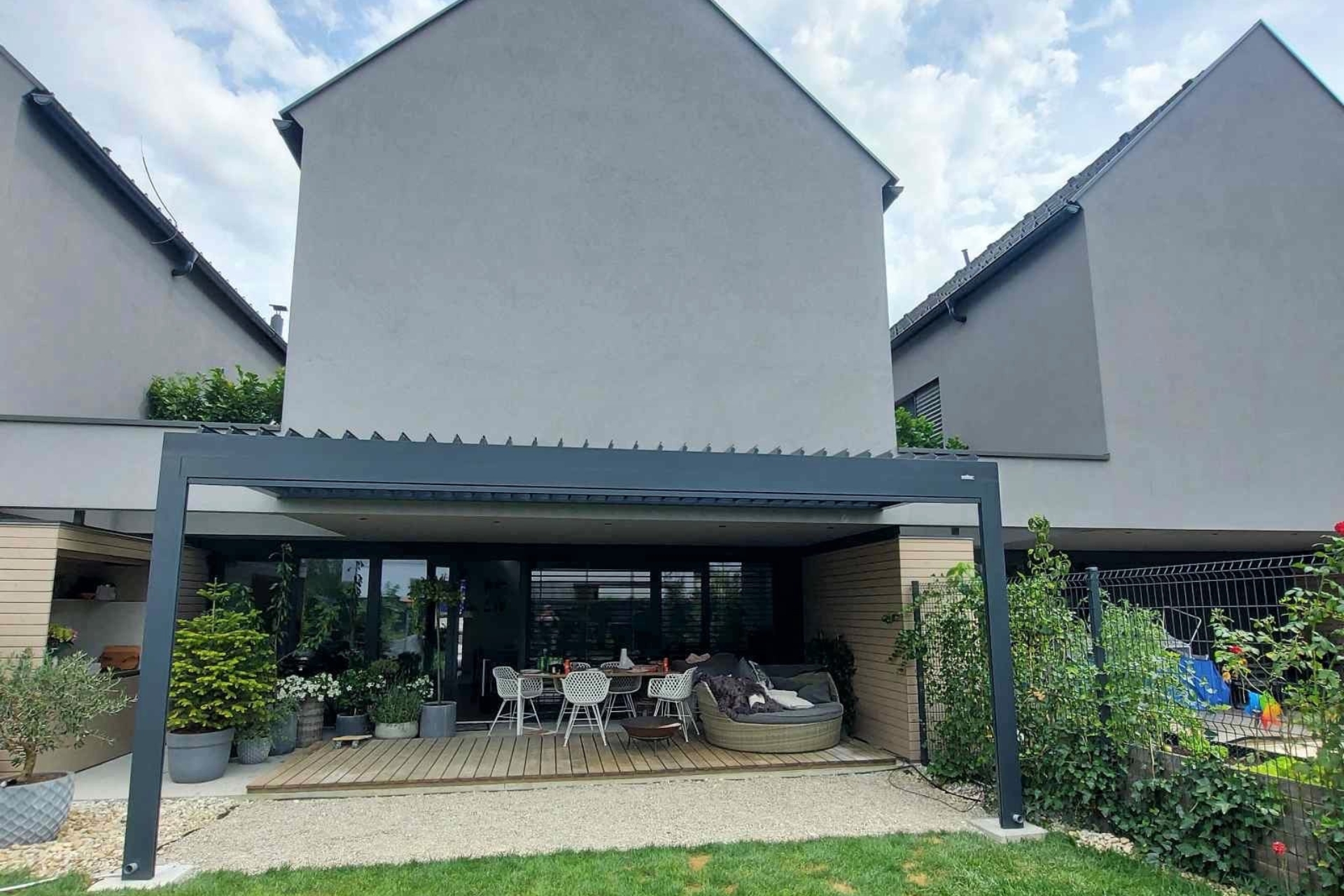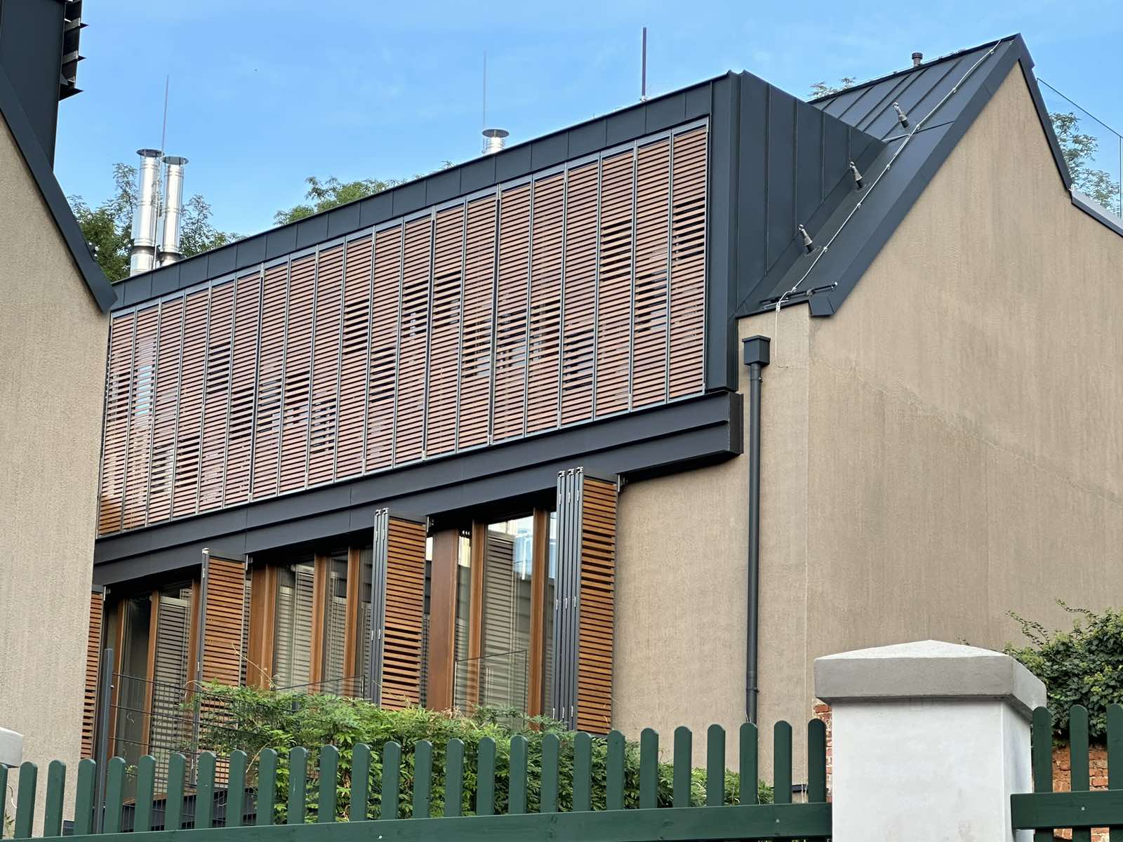 Dinamična fasada sa Soltec motoriziranim sklopivim panelima elegantno spaja sjenčanje, privatnost i modernu estetiku. Paneli od ekstrudiranog aluminija s drvenim dekorom tiho se otvaraju do 180° pomoću linearnih motora, čime omogućuju prilagodbu svjetlosti, topline i privatnosti. Zahvaljujući naprednoj sinkronizaciji motora, povezivanju s pametnim sustavom kuće i beskompromisnoj izvedbi, ova fasada postala je ključni element uspješne transformacije objekta, koji poštuje povijesni kontekst, ali diše modernim. Obnova zgrade nominirana je za Češku nacionalnu nagradu za arhitekturu.