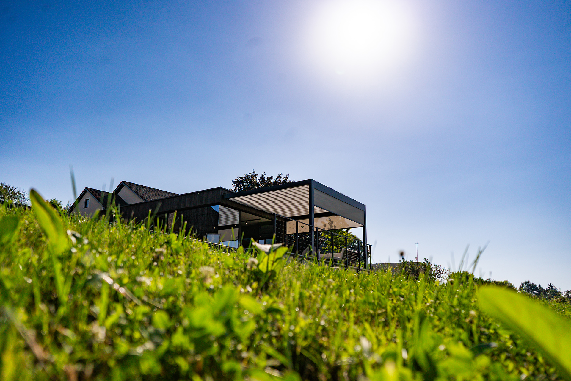 Ručno vođeni klizni paneli čine dinamičnu fasadu, dizajniranu za zahtjevne uvjete uz more – uključujući jake vjetrove do 120 km/h. Premišljena konstrukcija s panelima visine do 350 cm osigurava stabilnost. Paneli glatko klize po vodilicama i sigurno se zaključavaju u krajnjim položajima, jer patentirani sustav zaključavanja od opružnog čelika sprječava slučajno otvaranje ili zatvaranje panela uslijed jakog vjetra. Ova fasada korisniku pruža izuzetnu termičku i vizualnu udobnost, jer paneli zaustavljaju izravnu sunčevu svjetlost već na fasadnom omotaču. Prostor ostaje ugodno hladan, osvijetljen blagom, indirektnom svjetlošću bez odsjaja – kako u loži tako i u unutrašnjosti objekta. Zimi korisnik može lako otvoriti panele i iskoristiti pasivno grijanje izravnim sunčevim zrakama. Nasumične pozicije panela svakodnevno daju zgradi drugačiji, jedinstveni izgled.