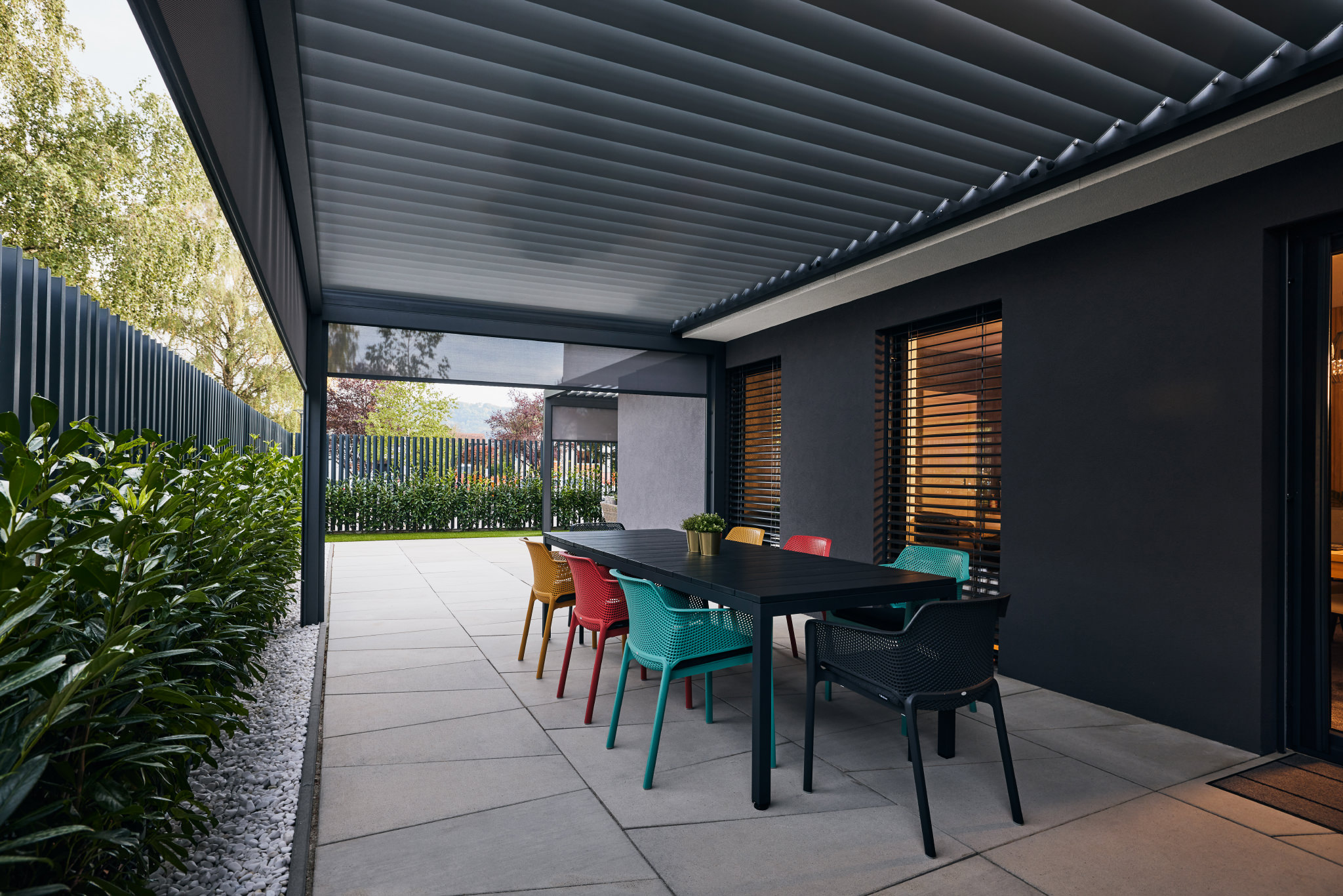 When the blades are closed, the pergola is waterproof. Combining EPDM rubber suitable for outdoor use with the overlapping blade profile ensures water resistance.