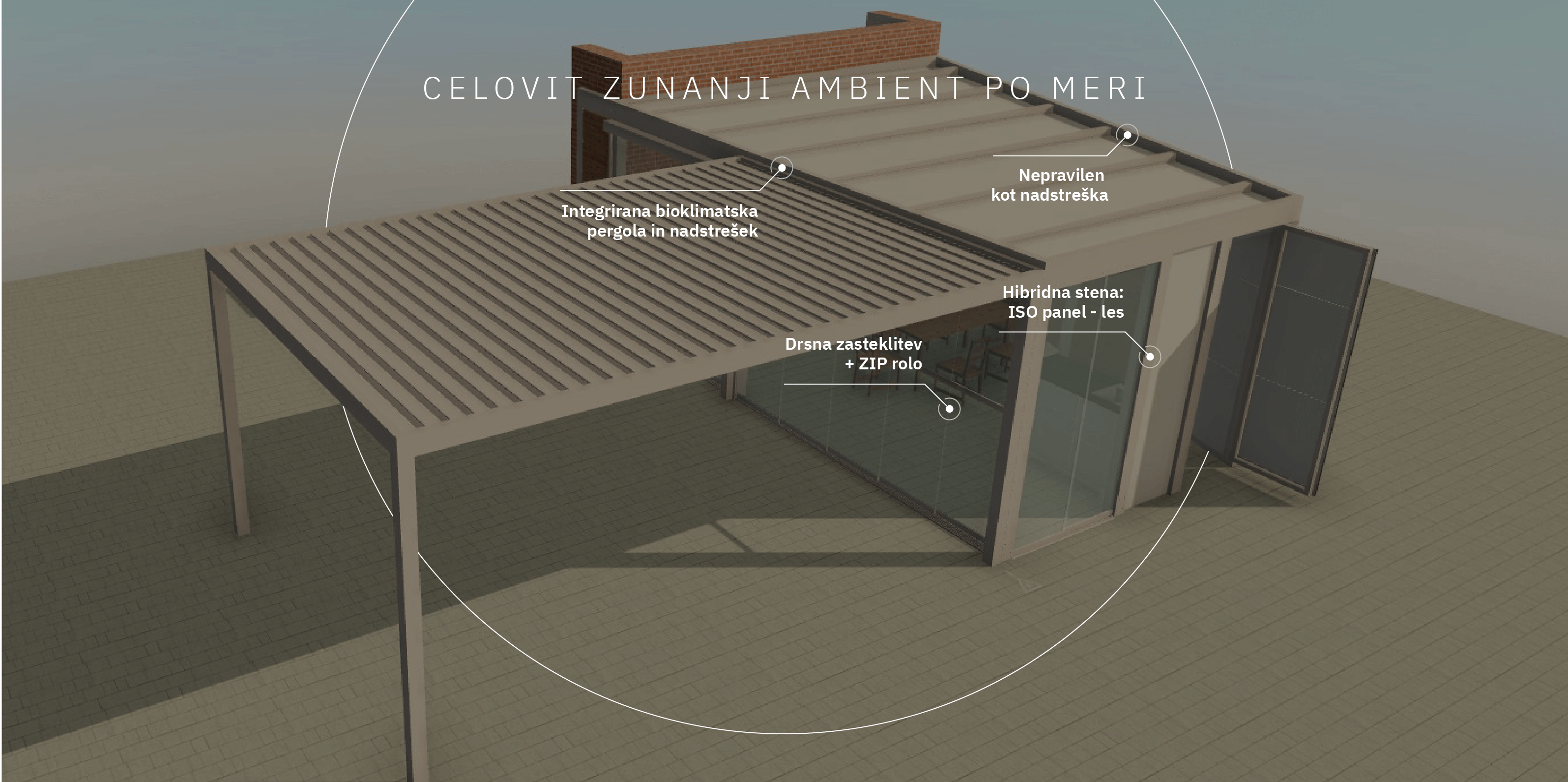 - V lamele bioklimatske pergole – diskretna rešitev, ki zagotavlja enakomerno osvetlitev tudi ob obračanju lamel.